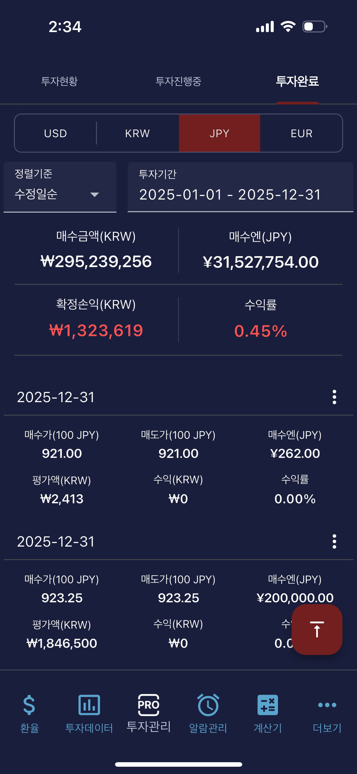 25년 엔화 결산 Damoney 환율 2026. 1. 15. 1. 25년 엔화 결산 24년에 비해 시드가 여기저기 분산되느라 투자 금액이 적었다. 전체 거래액은 비슷한데 수익률이 낮은걸 보니 참을성이 많이 줄어든 것 같기도 하고... 한동안 엔화가 높았던 구간도 많긴 했었다 26년은 200만원을 넘겨봐야겠다 퐈이팅 😇 공유하기 게시글 관리 Damoney